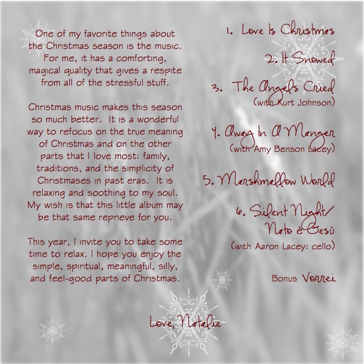 Natalie recorded this album as a gift to her family and friends. Read her album notes for a glimpse into this wonderful labor of love. –Amy